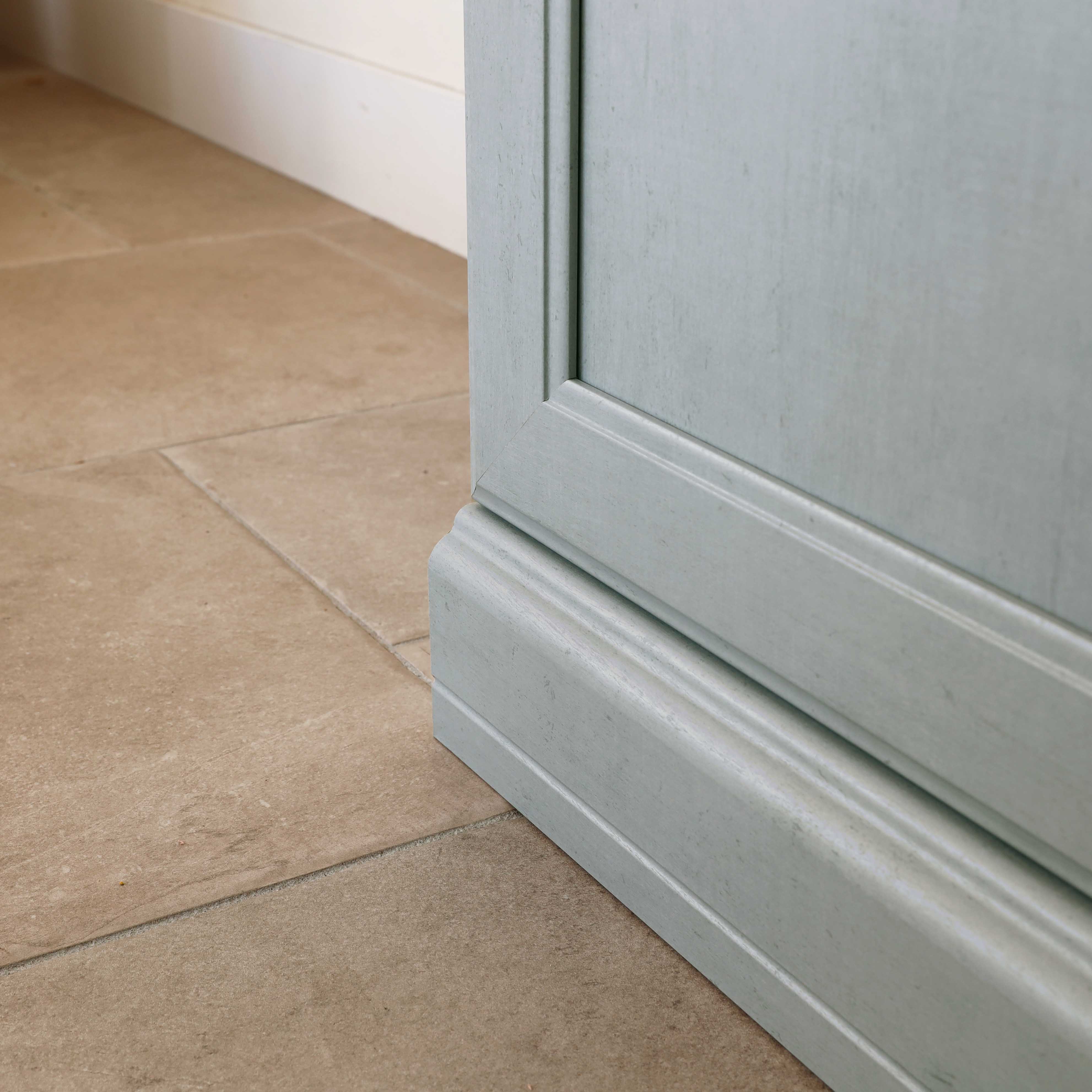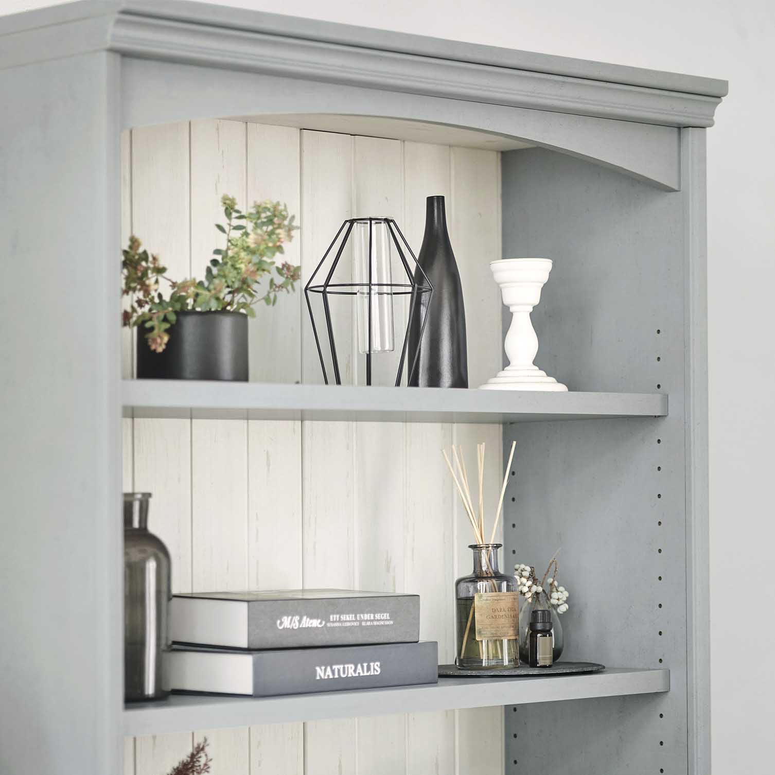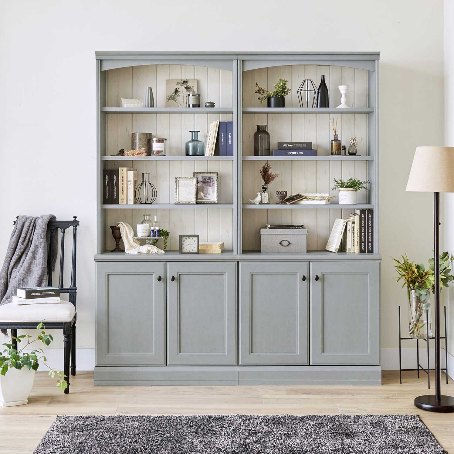 背板には溝加工を施し、ディスプレイしたアンティーク雑貨が映えるデザインです。グレーと相性の良い白木目がより引き立てます。