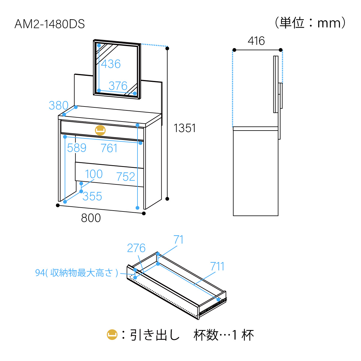メイク道具を収納できる引き出しは幅71cmで大容量。深さ9.4cmでコンパクトやパレット、ネイルポリッシュを立てて収納できます。市販のケースで仕切れば、すっきり収納できます。