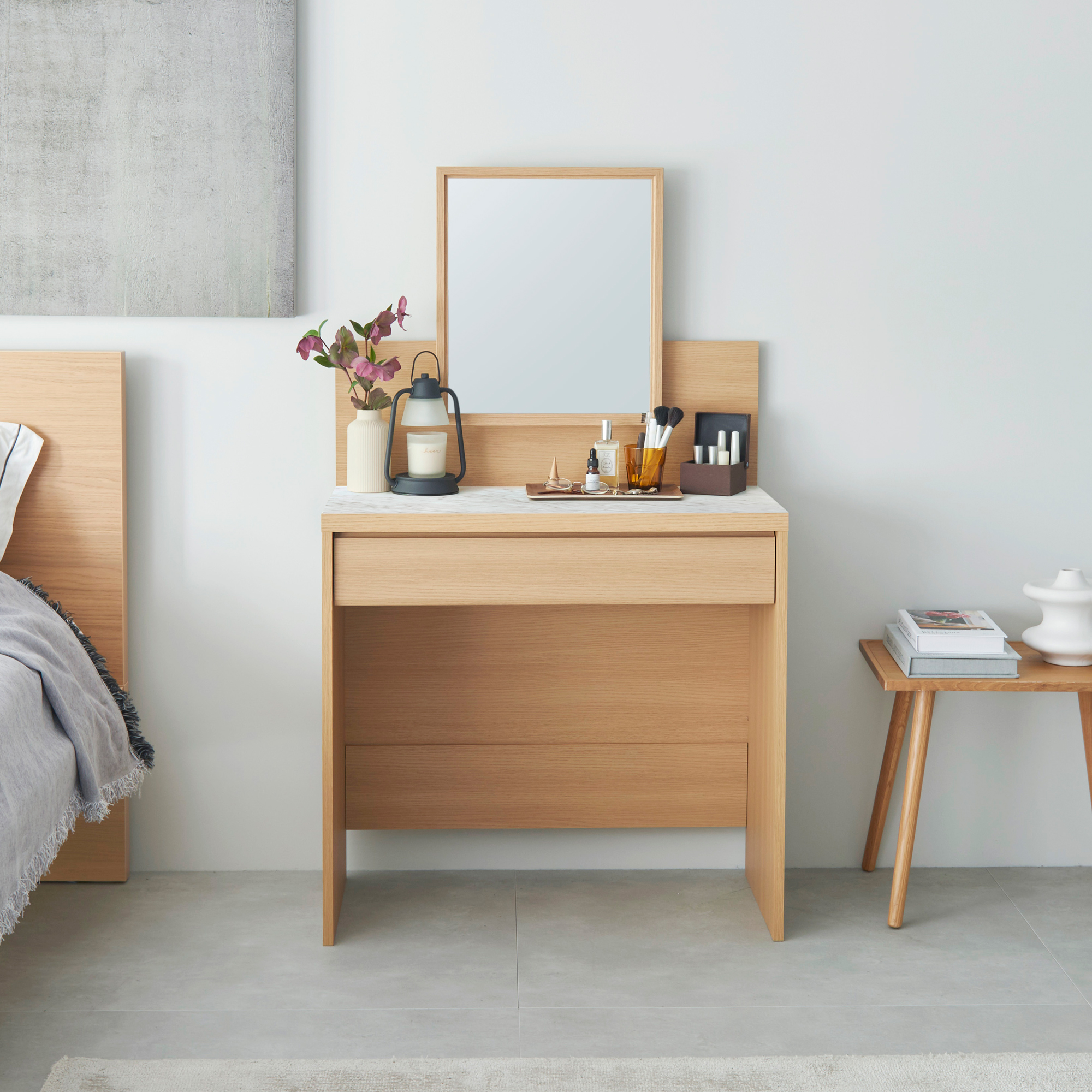 汚れに強いメラミン天板。幅80cm、奥行38cmの広々とした天板で快適にメイクできます。おしゃれな大理石調がインテリアのアクセントに。マットな質感でお部屋なじみもいいデザインです。
