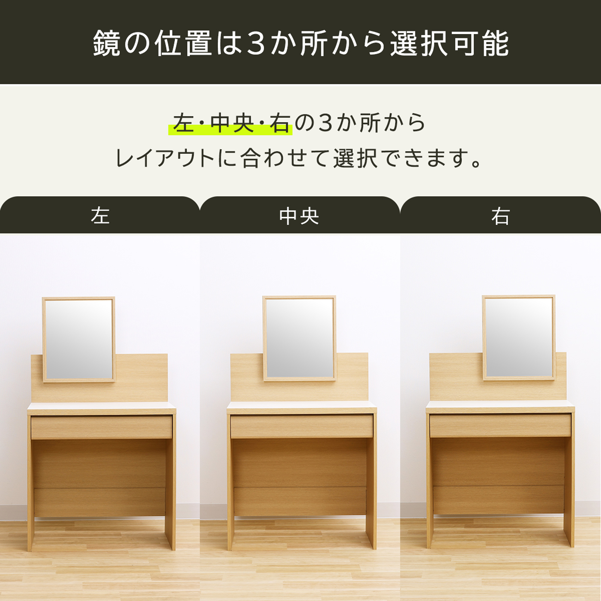 頭の上からデコルテまで移せる大きめの鏡は、左右中央の3か所から選択可能。お部屋のレイアウトやワゴンの位置に合わせて選ぶことができます。