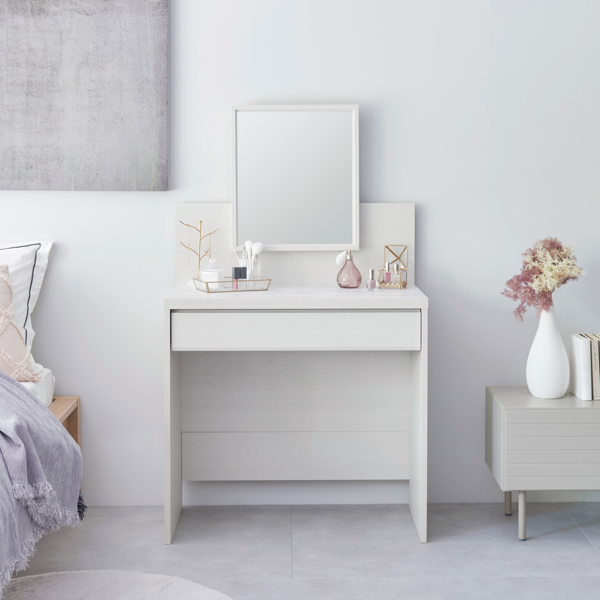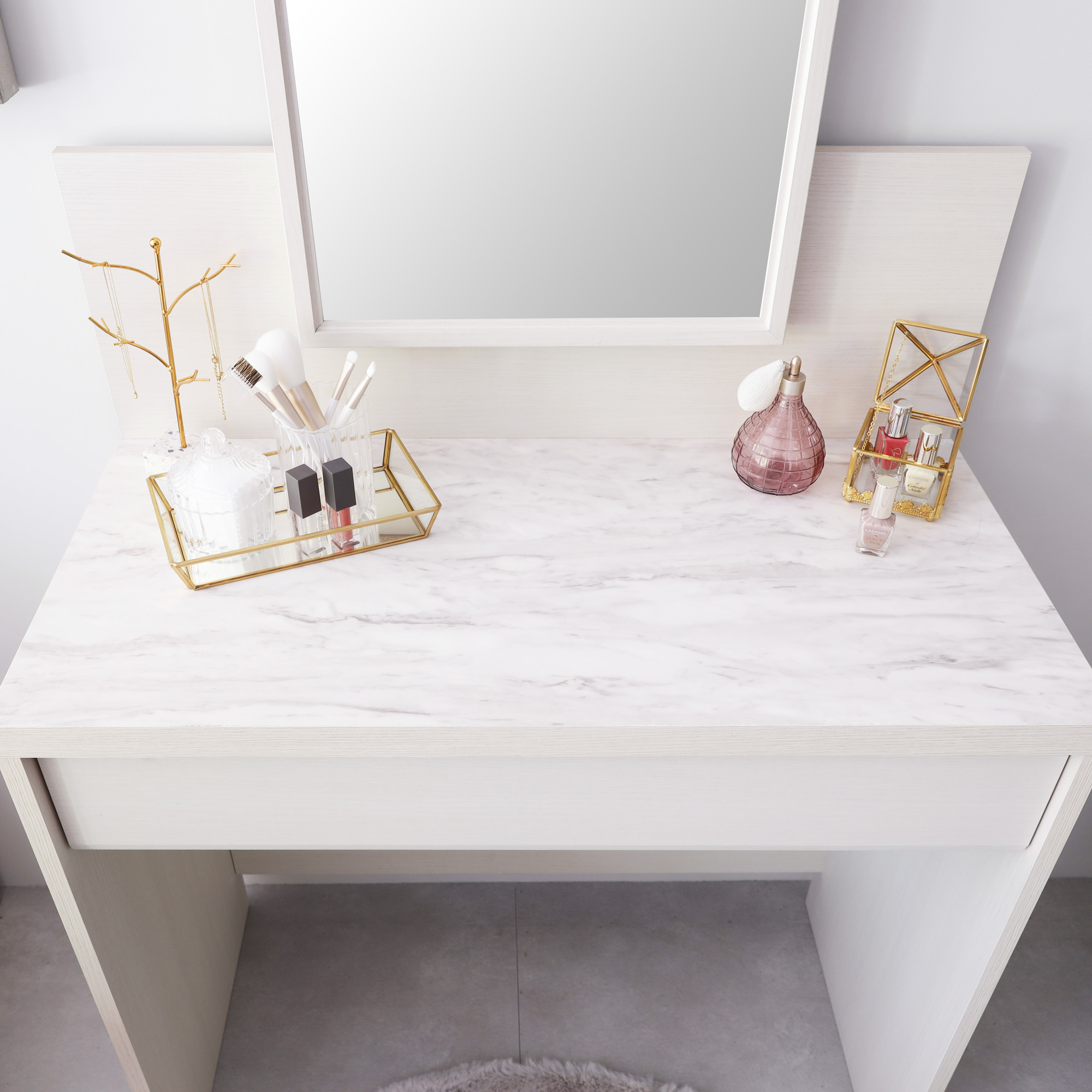 汚れに強いメラミン天板。幅80cm、奥行38cmの広々とした天板で快適にメイクできます。おしゃれな大理石調がインテリアのアクセントに。マットな質感でお部屋なじみもいいデザインです。