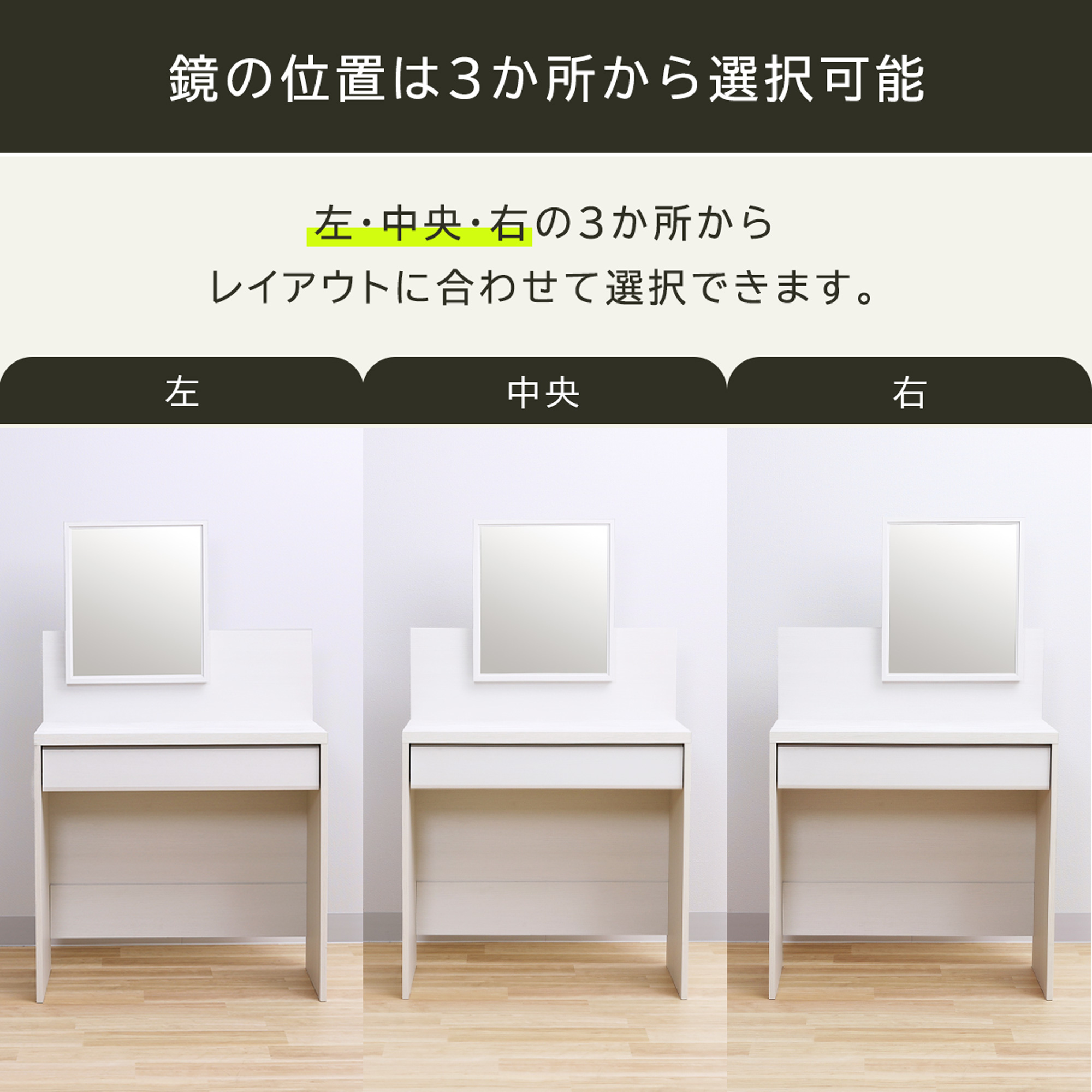 頭の上からデコルテまで移せる大きめの鏡は、左右中央の3か所から選択可能。お部屋のレイアウトやワゴンの位置に合わせて選ぶことができます。