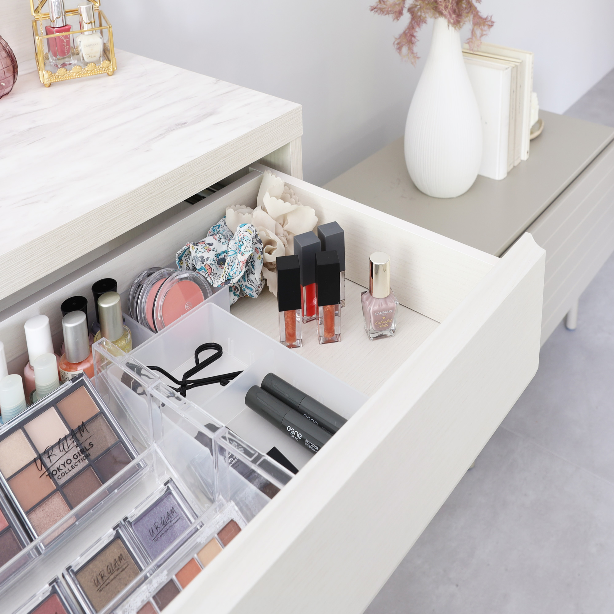メイク道具を収納できる引き出しは幅71cmで大容量。深さ9.4cmでコンパクトやパレット、ネイルポリッシュを立てて収納できます。市販のケースで仕切れば、すっきり収納できます。