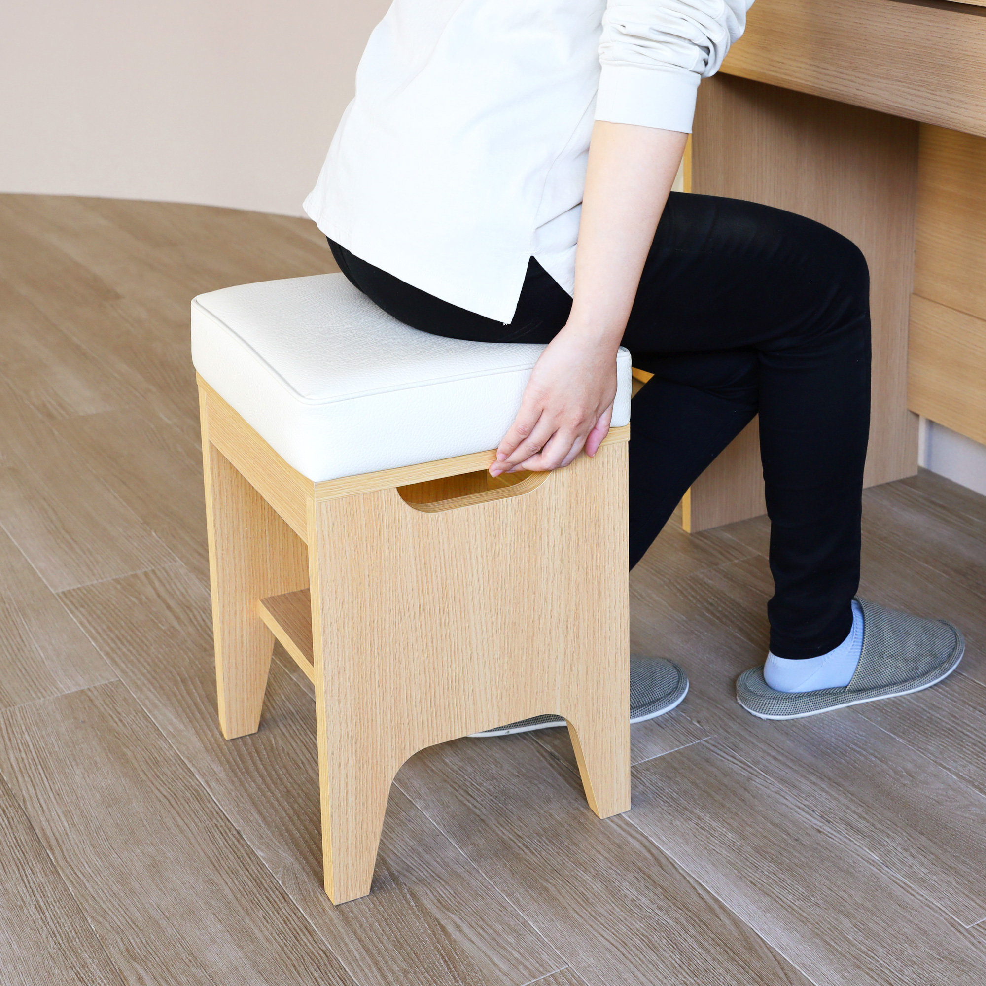 ドレッサーに合わせたシンプルなデザインのスツール。ちょうどいい高さで快適にメイクできます。