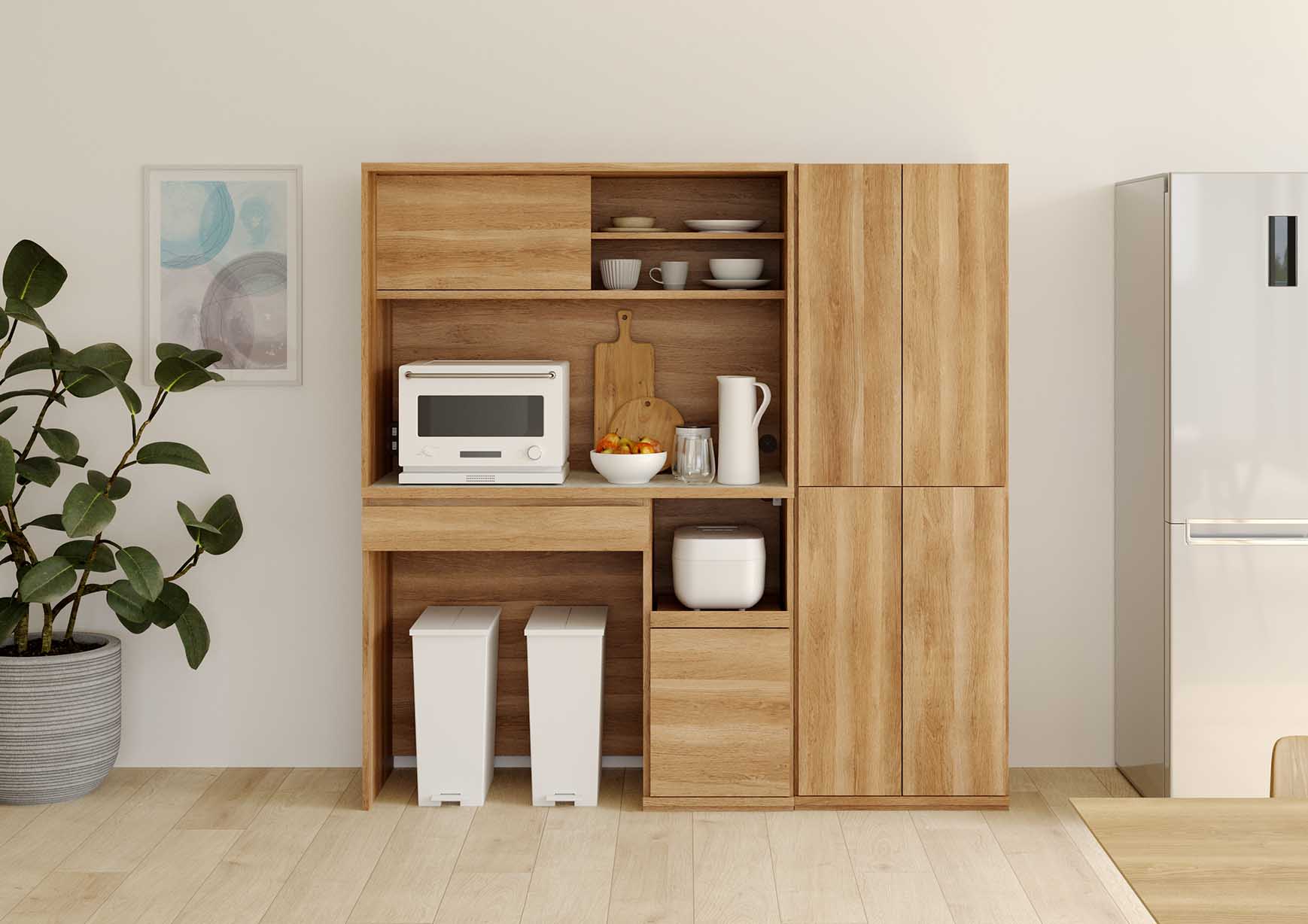 幅116.2cmの中天板には、電子レンジやトースターなどを並べて、時短料理を楽しめます。※電気製品の説明書の設置方法をご確認の上ご使用ください