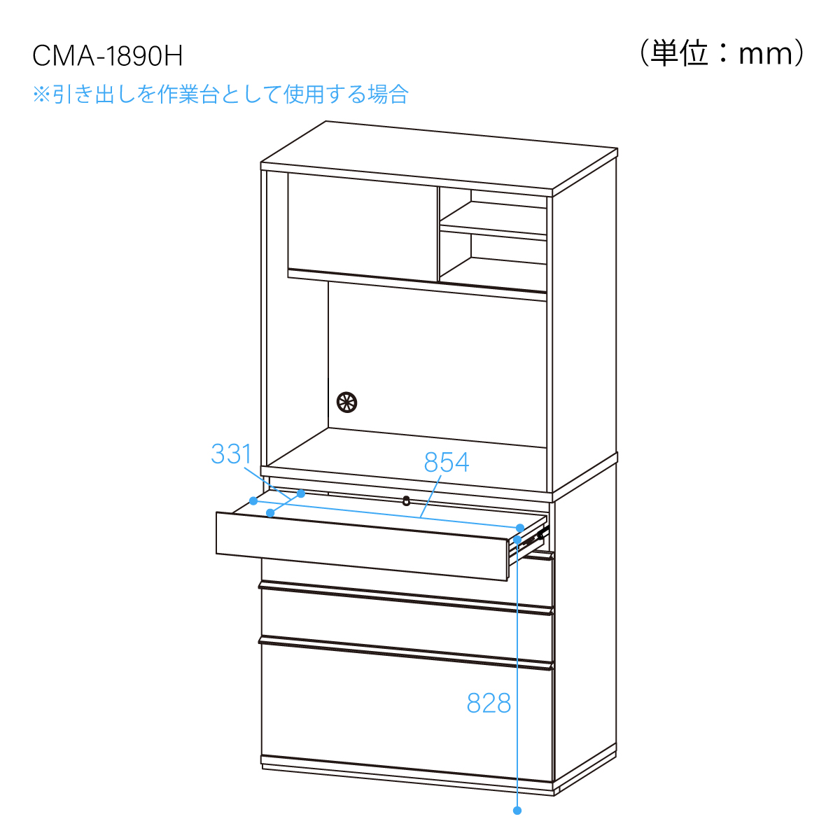 作業台は、引き出しとのリバーシブル。調理の盛り付け作業や調理中の食材置き場として使えるスライド作業棚としても使用でき、反転させると引出としてもお使いいただけます。