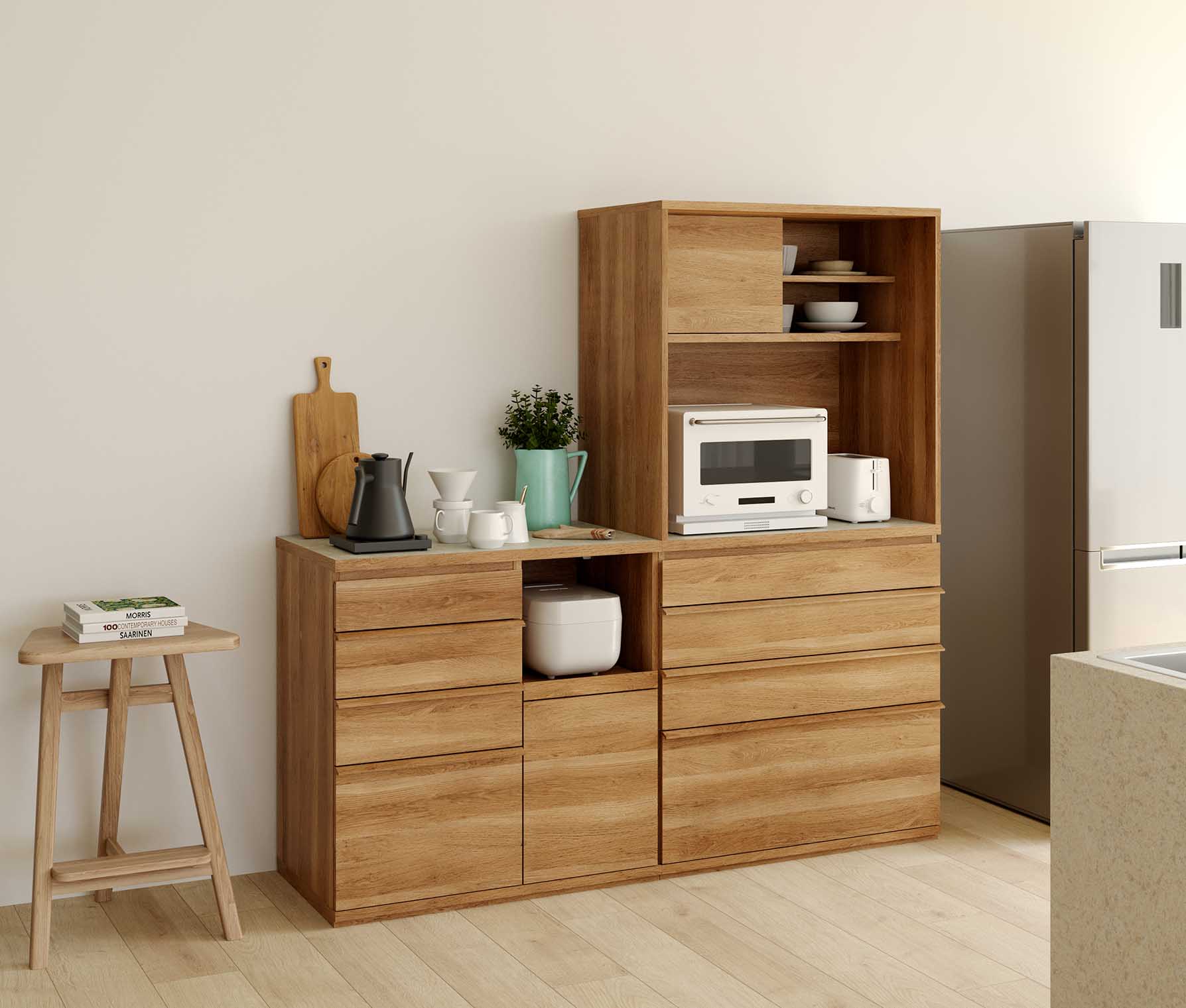 幅86.2cmの中天板には、電子レンジやトースターなどを並べて、時短料理を楽しめます。※電気製品の説明書の設置方法をご確認の上ご使用ください。