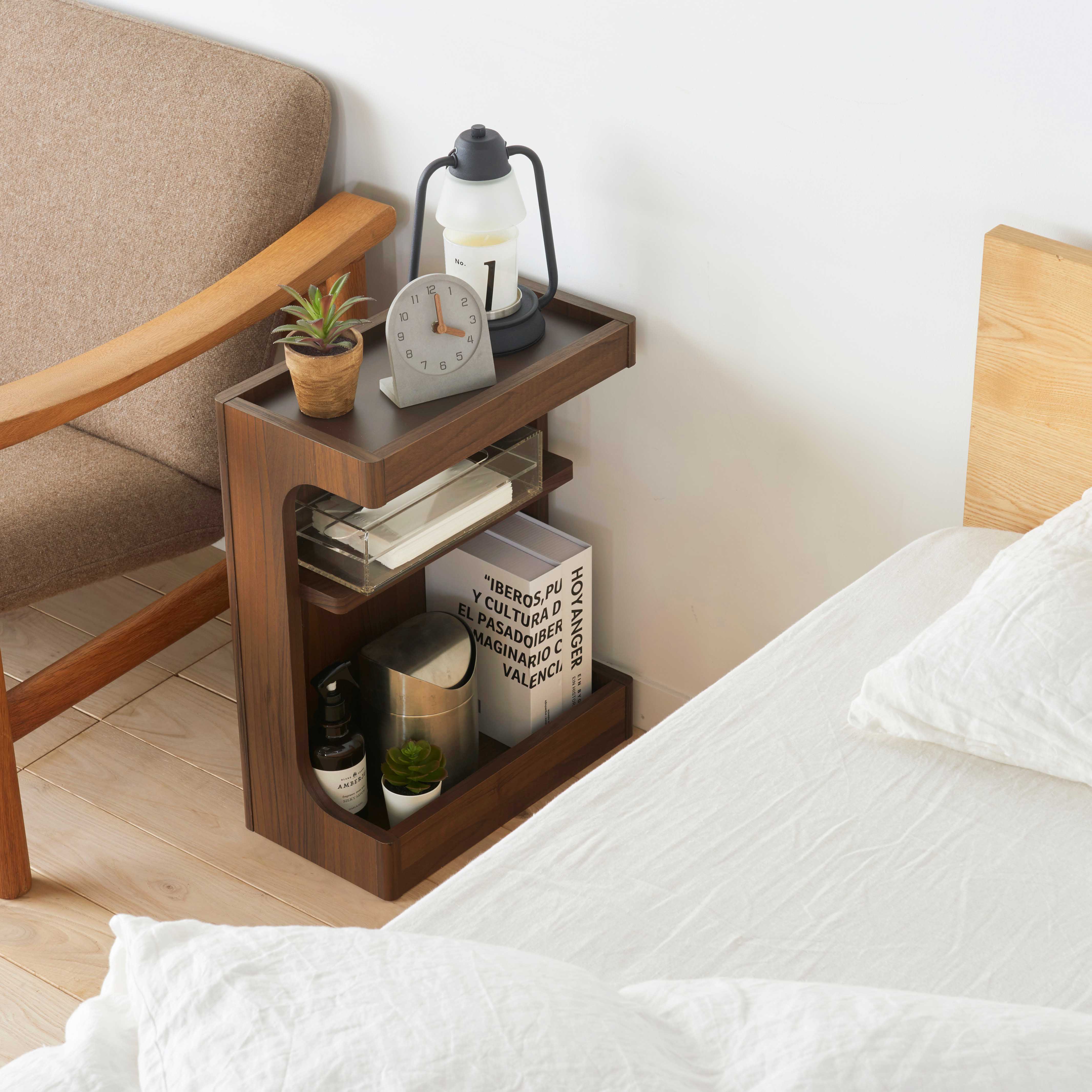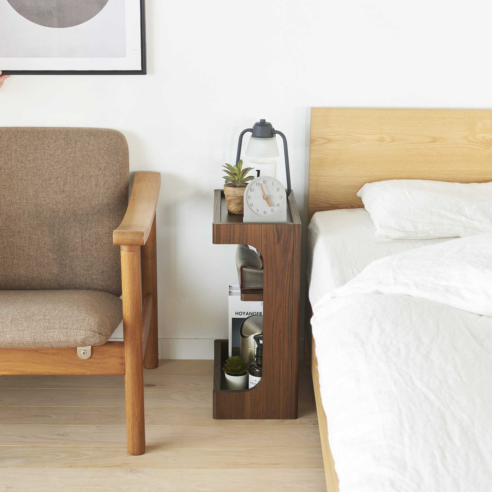 ベッド周りを快適にするサイドテーブル、チルフィル。隙間におけるスリムなサイズで、ベッド周りやソファ周りで使えるよう背面化粧済み。
