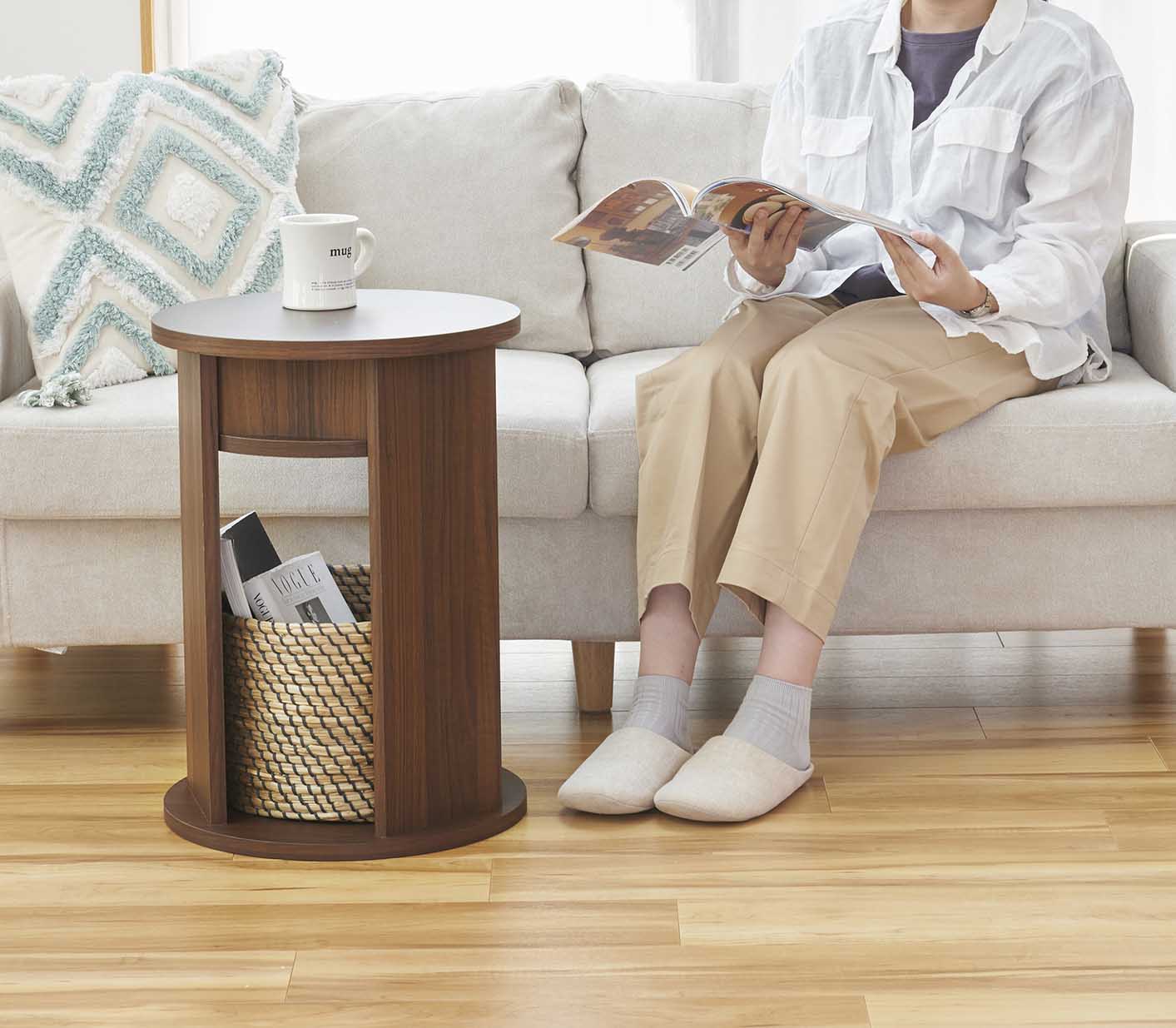 ソファの足元に差し込めるので、ソファでくつろいだ姿勢でも手の届く範囲にものを置くことができます。※床から底面の高さ1.8cm以上、座面の高さ41.4cm以下のソファに差し込めます