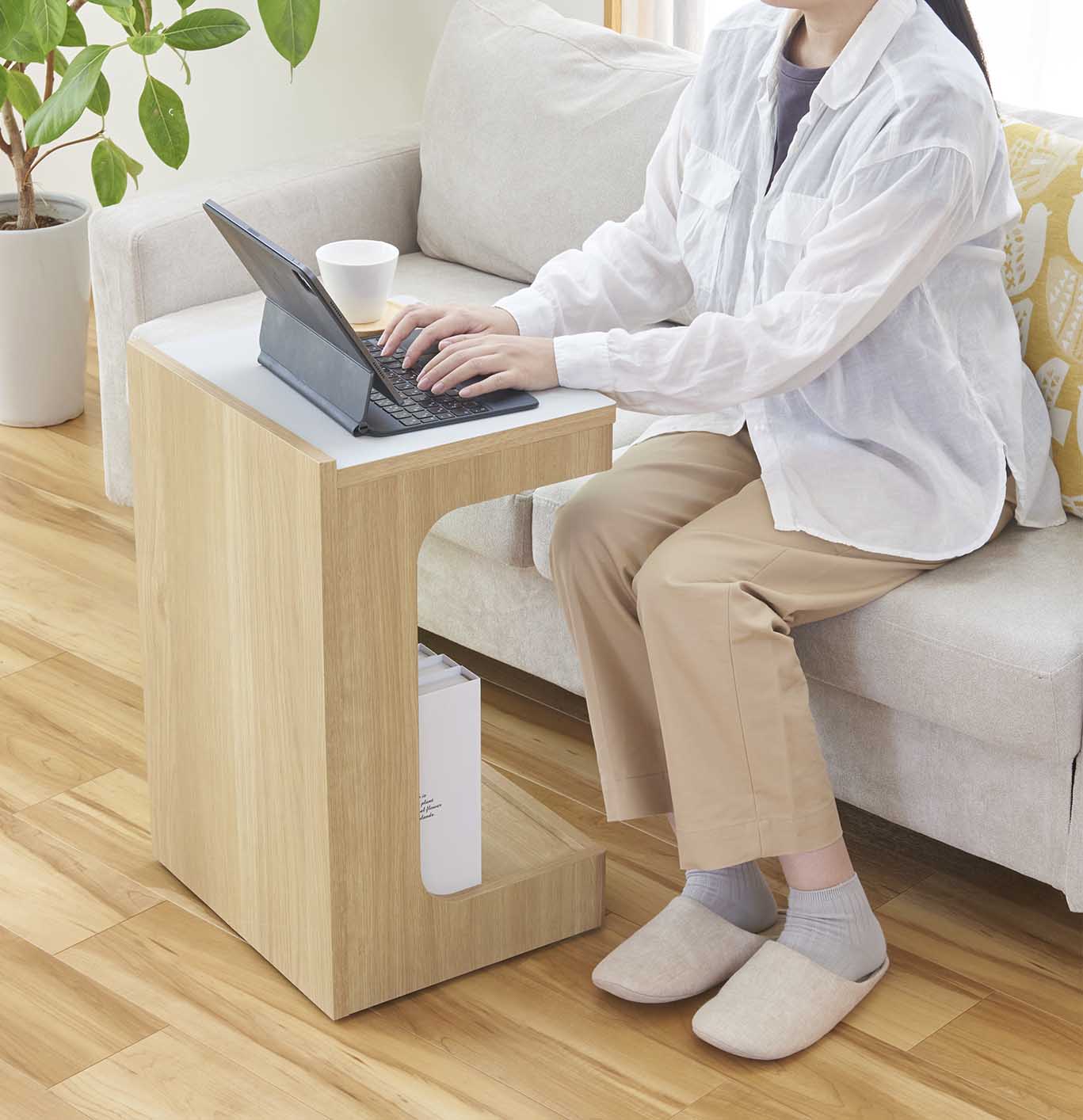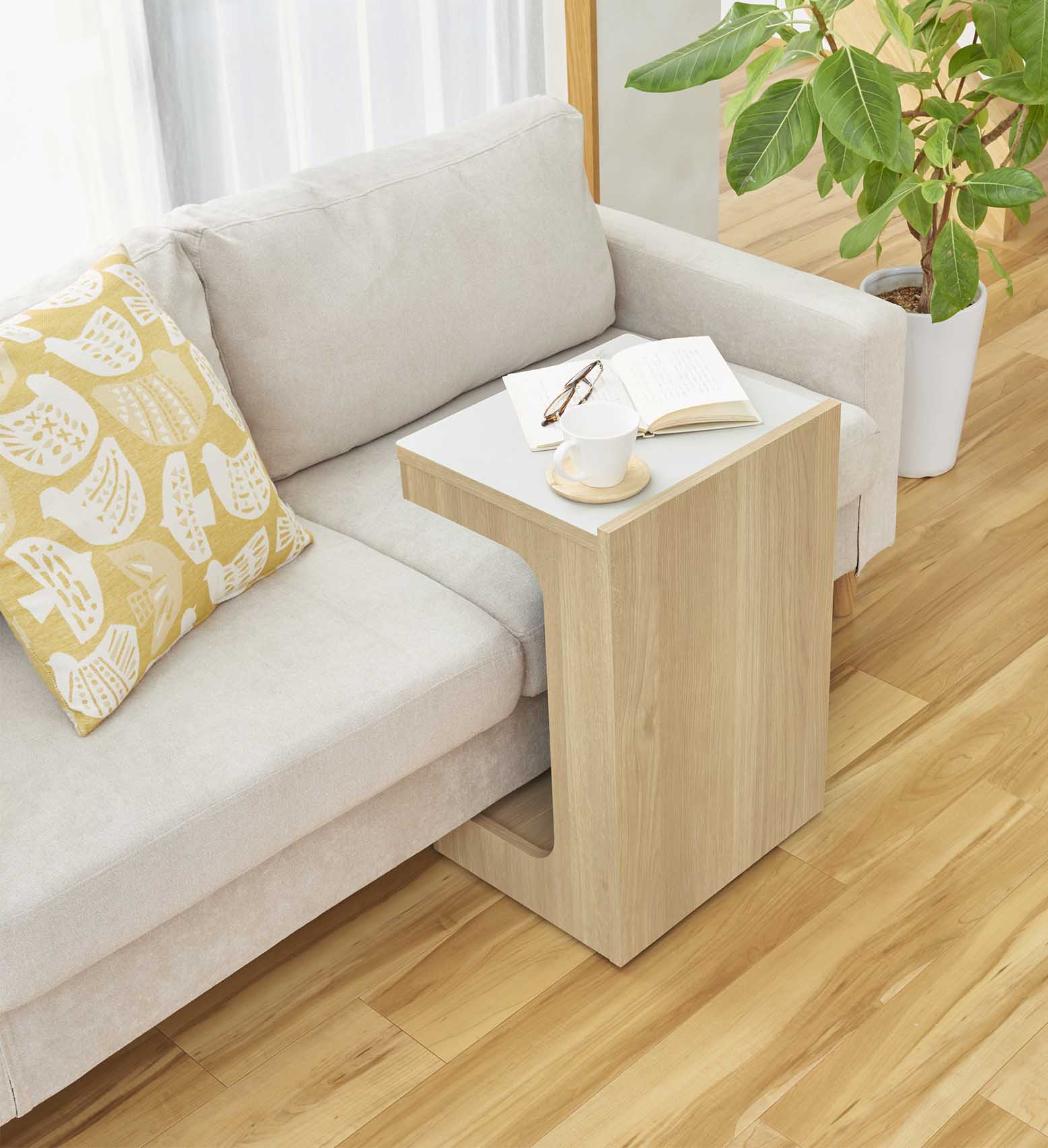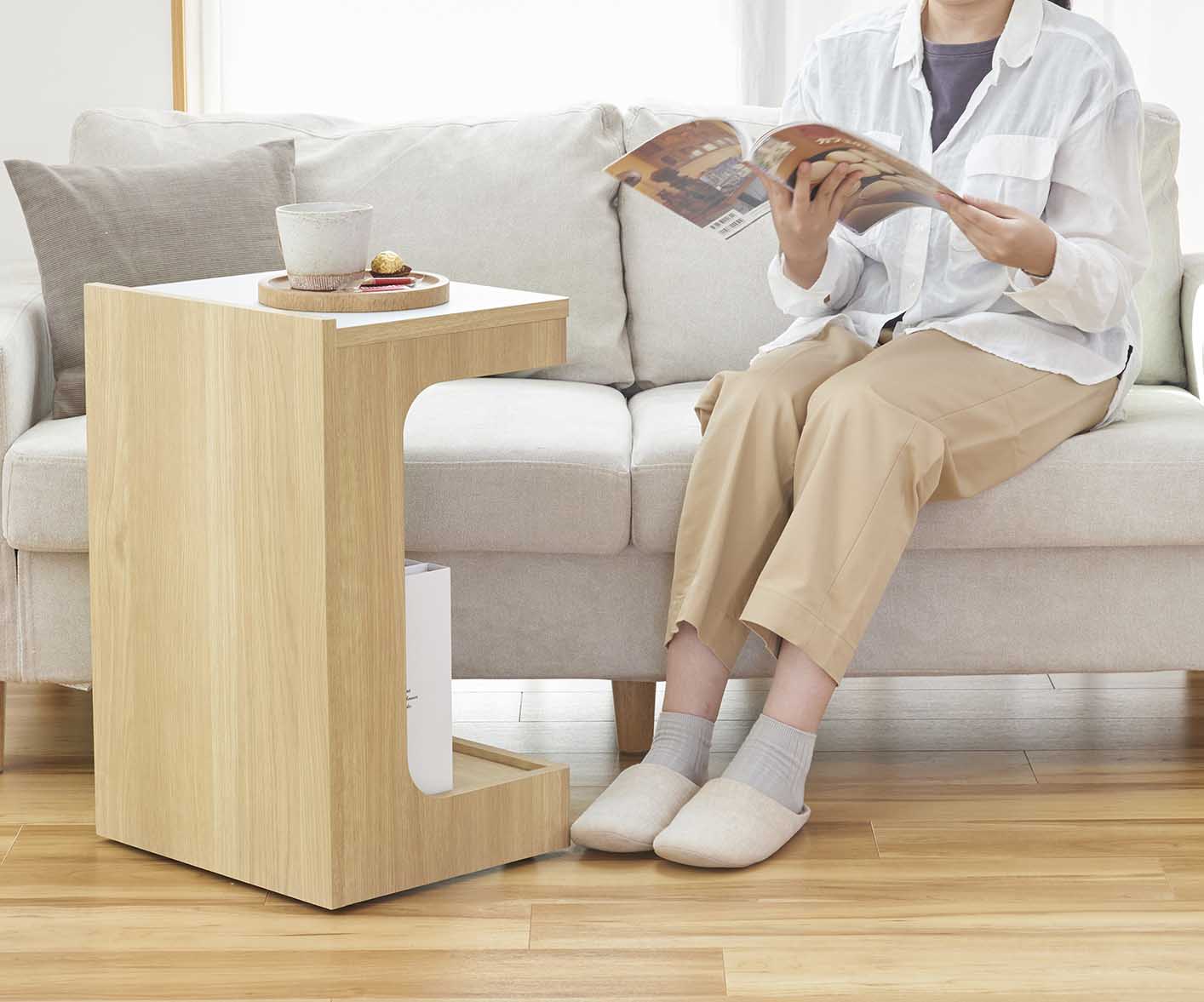 ソファの足元に差し込めるので、ソファでくつろいだ姿勢でも手の届く範囲にものを置くことができます。※床から底面の高さ9.5cm以上、座面の高さ51.9cm以下のソファに差し込めます。