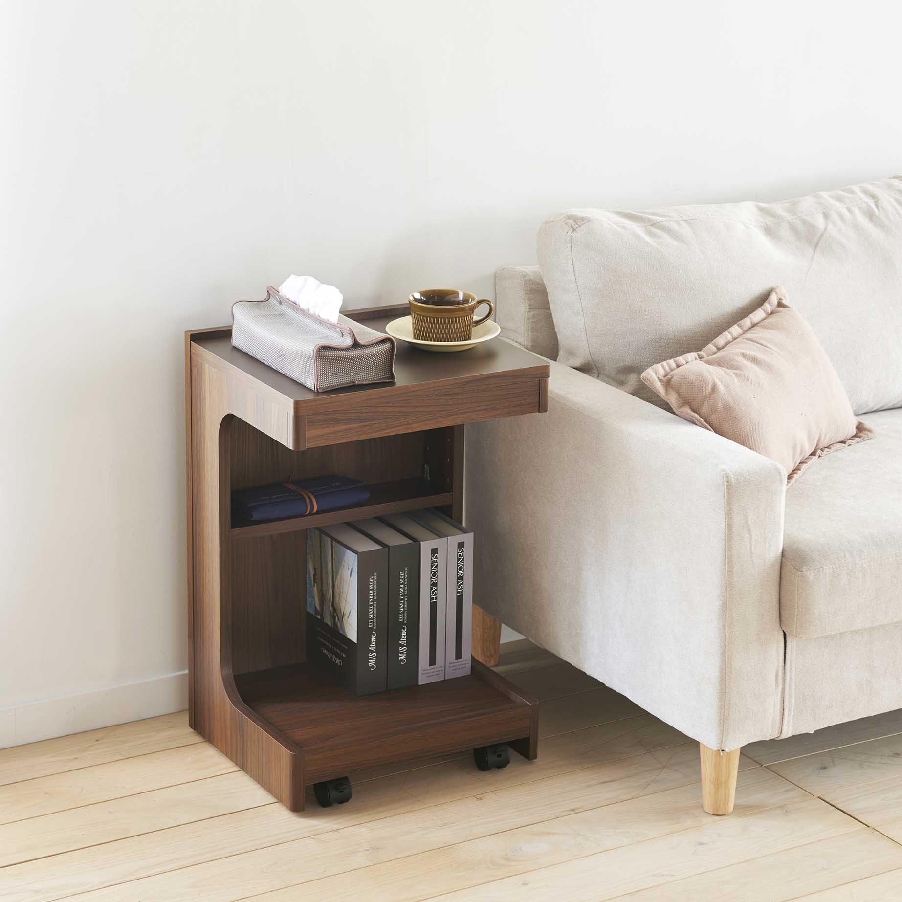 ソファの足元に差し込めるので、ソファでくつろいだ姿勢でも手の届く範囲にものを置くことができます。※床から底面の高さ9.5cm以上、座面の高さ51.9cm以下のソファに差し込めます。