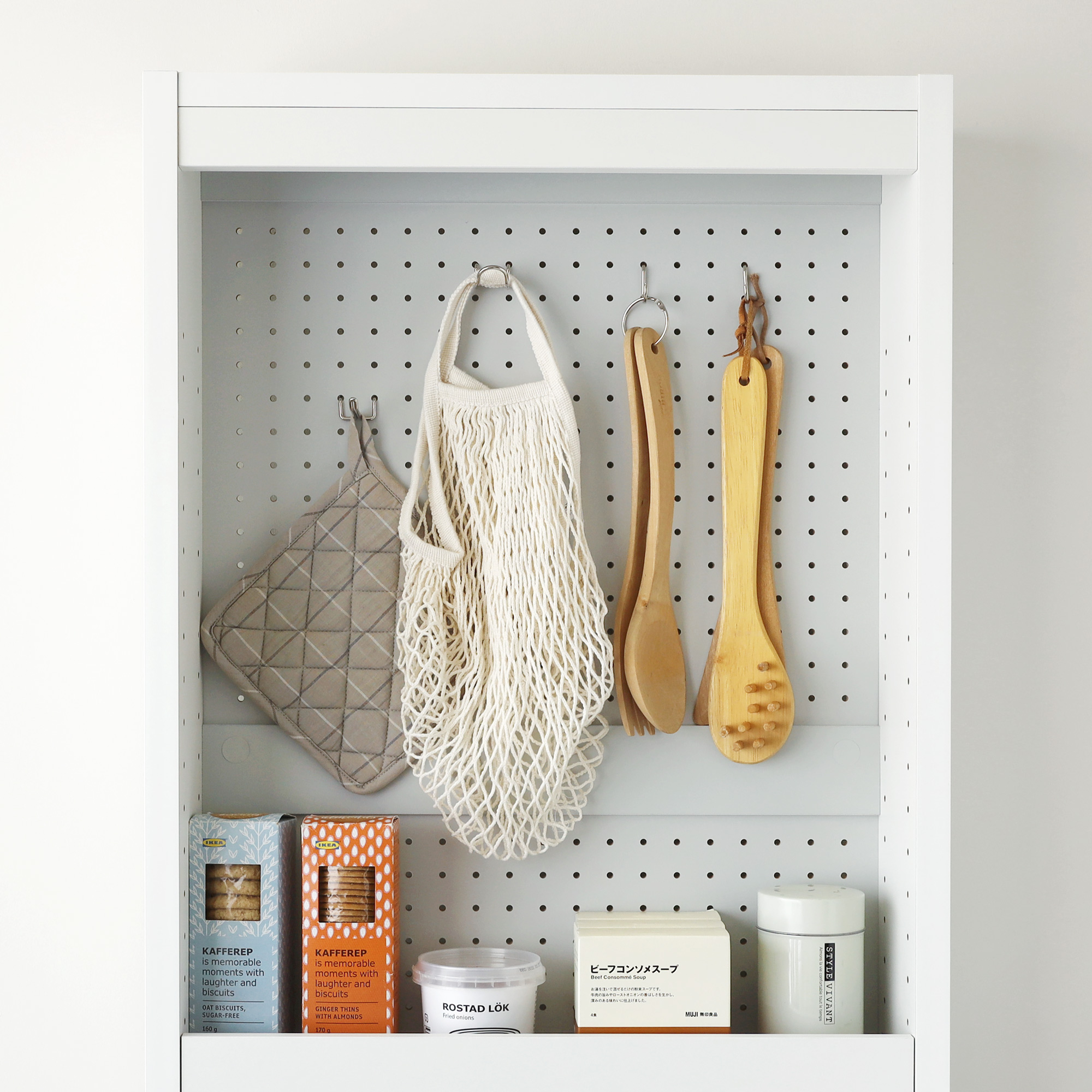 上部の背板は有孔ボード仕様。市販のフックを使えば、おたまやフライ返し、ミトンなどのキッチンツールを掛けて収納できます。※有孔ボード耐荷重3kg