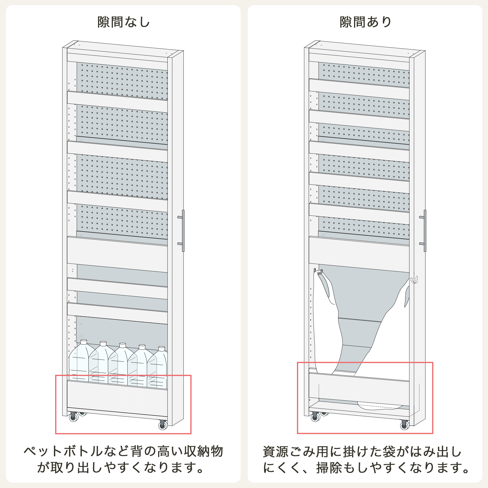 最下段の前板の位置を2か所から選べます。隙間がない方はペットボトルなど背の高い収納物を取り出しやすく、隙間のある方は資源ごみスペースにしたとき使いやすくなり、掃除もしやすくなります。※組立時にどちらか選択してください。