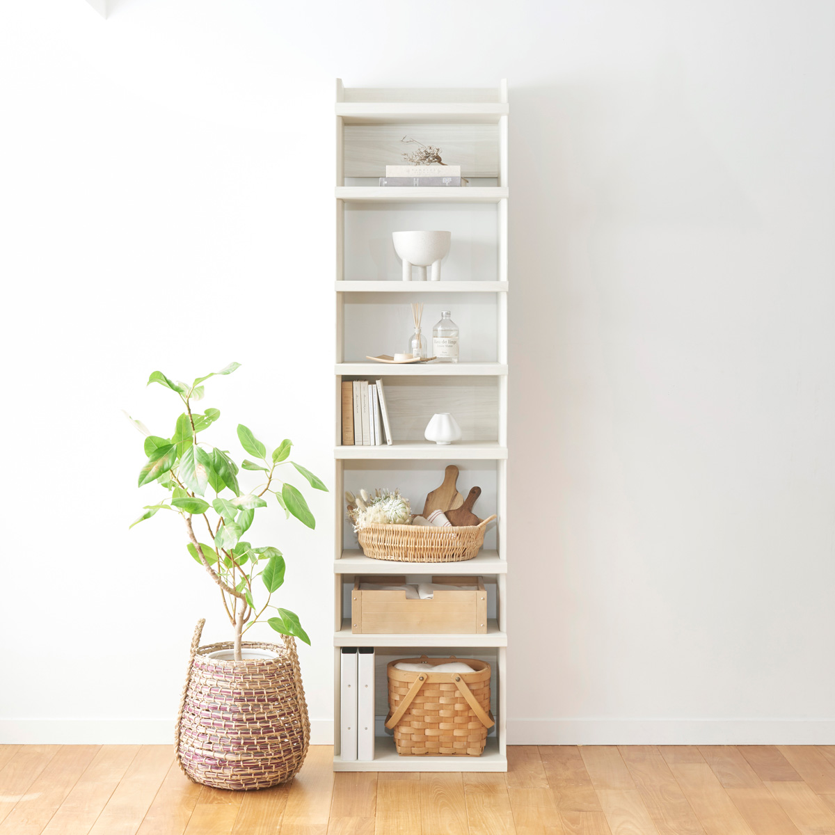 厚い棚板が力強く存在感を放つ、高さ2mの大型オープンラック、トルフラット。造りつけの棚のような大容量収納をつくることができます。免震補助バンド付き。