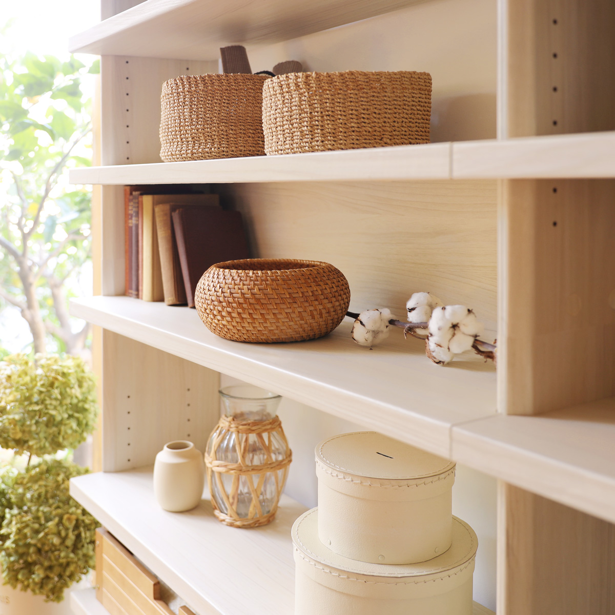 側板のフチを斜めにカットし薄く見せることで、厚みのある棚板の横ラインを強調し魅力を引き立てます。