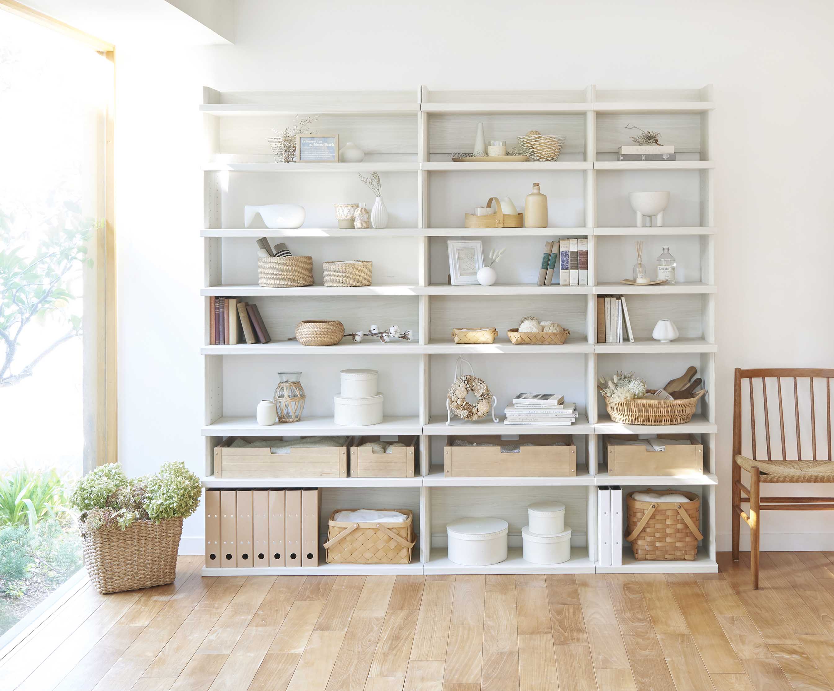 厚い棚板が力強く存在感を放つ、高さ2mの大型オープンラック。造りつけの棚のような大型収納。