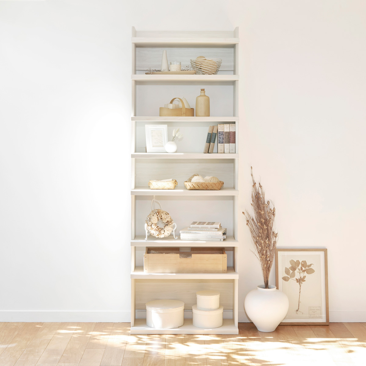厚い棚板が力強く存在感を放つ、高さ2mの大型オープンラック、トルフラット。造りつけの棚のような大容量収納をつくることができます。免震補助バンド付き。