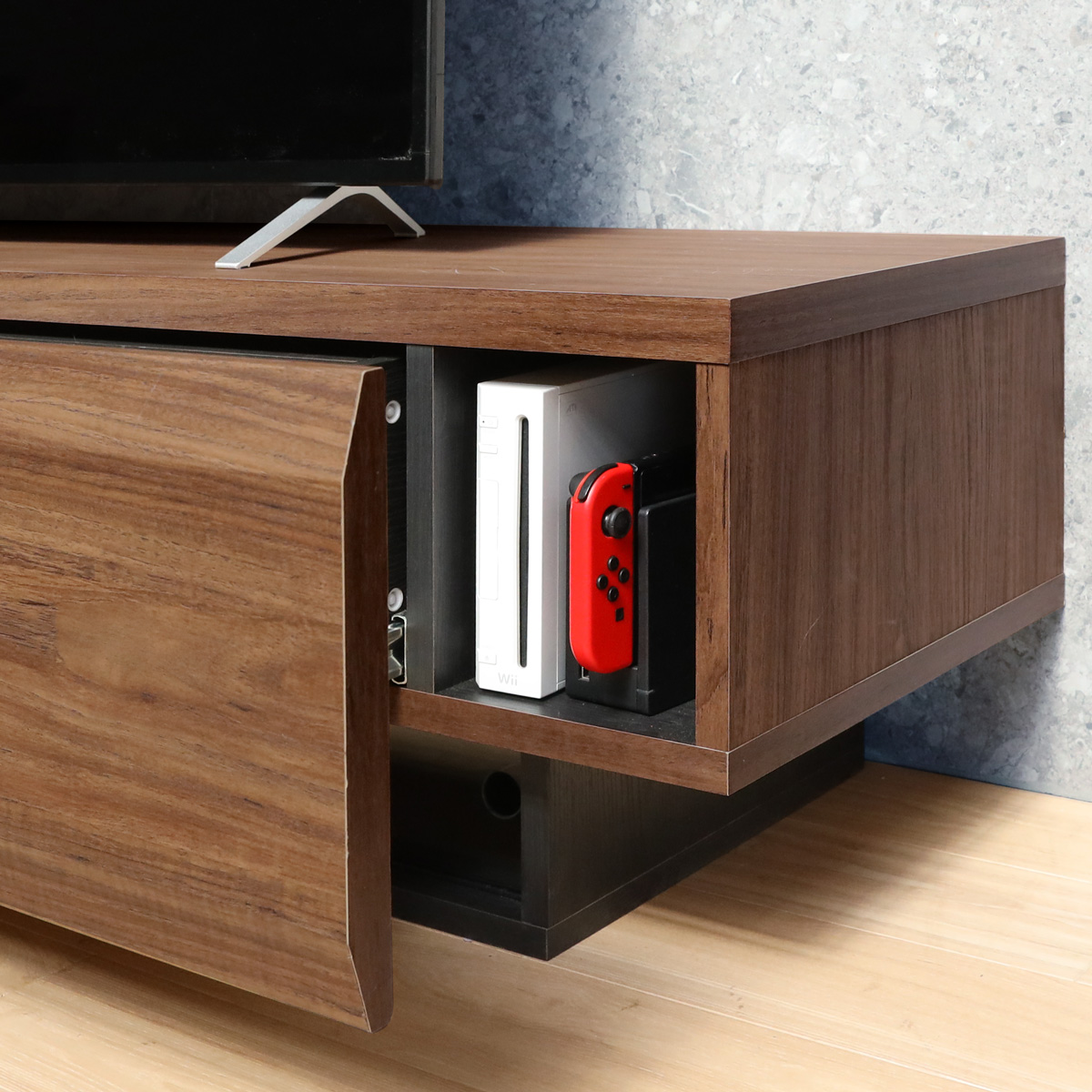引出の右側には、Wi-FiルーターやSwitch等、縦置きのゲーム機が入るスペースがあります。