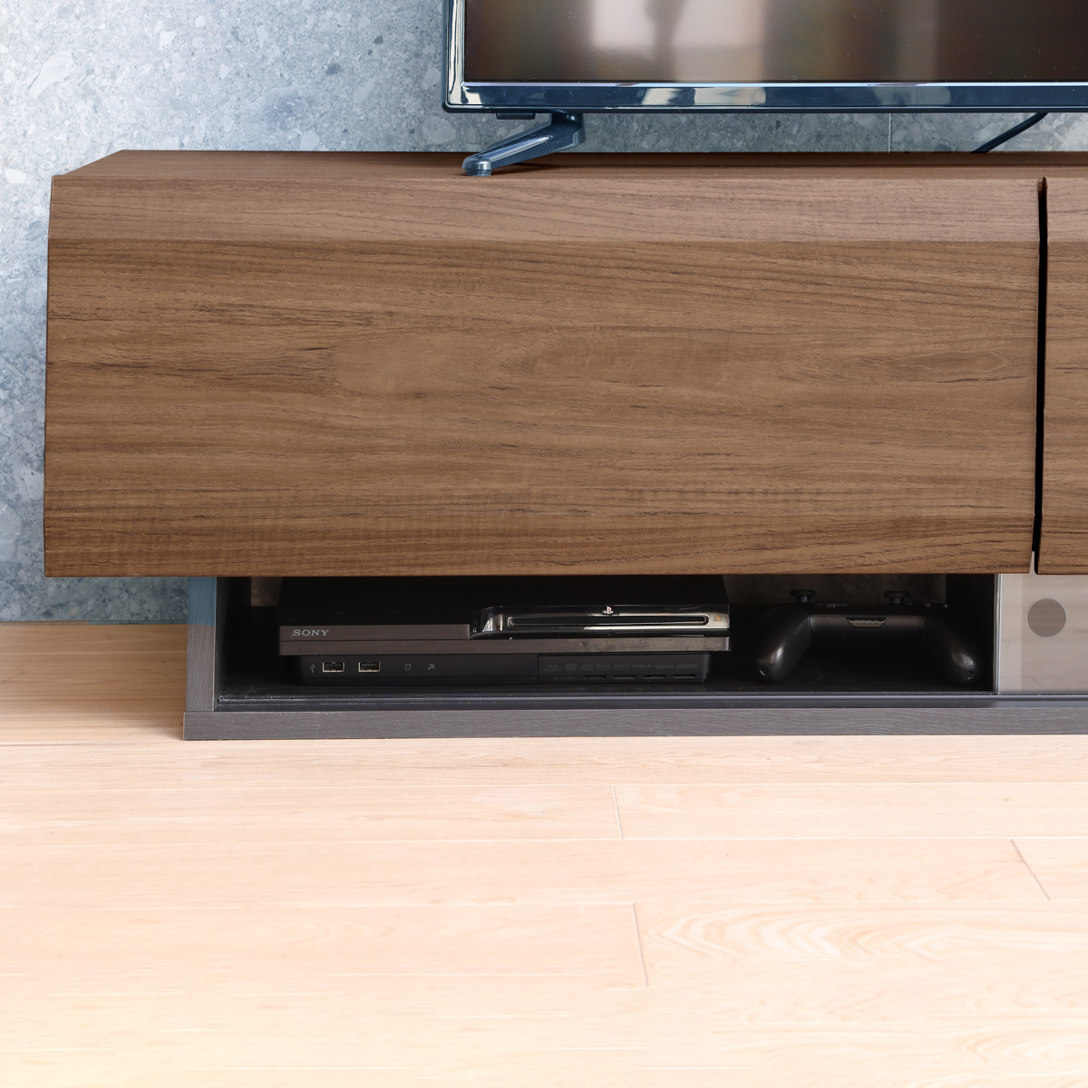 ブルーレイディスクやDVDプレイヤーの収納は、引き出しの下に。引き戸はガラス戸を採用しているので、リモコンの通りも問題ありません。