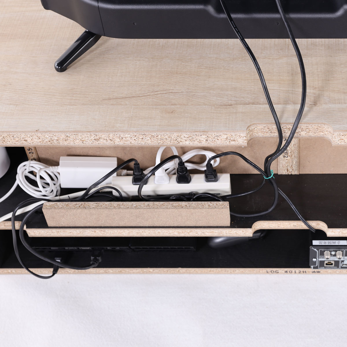 電源線を引きやすくきれいに収納できるように、電源タップの収納ゾーンや配線穴を設けています。