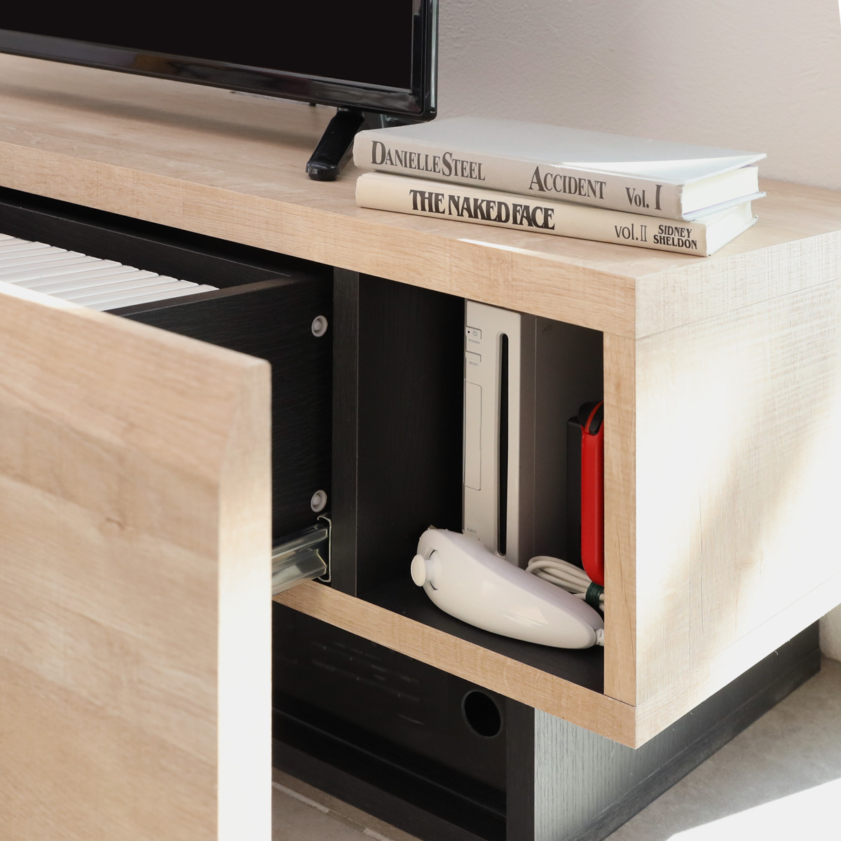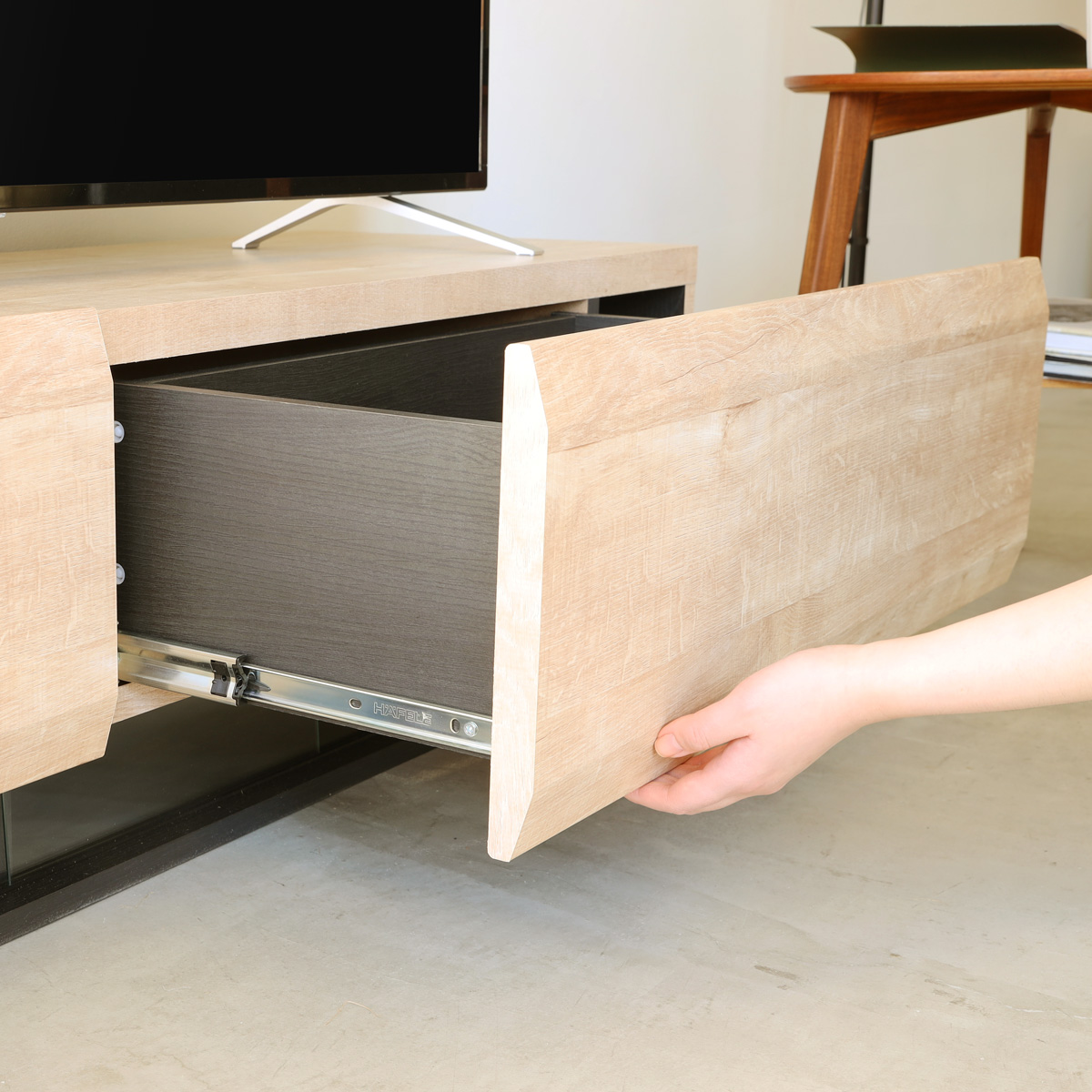 ブルーレイディスクやDVDプレイヤーの収納は、引き出しの下に。引き戸はガラス戸を採用しているので、リモコンの通りも問題ありません。