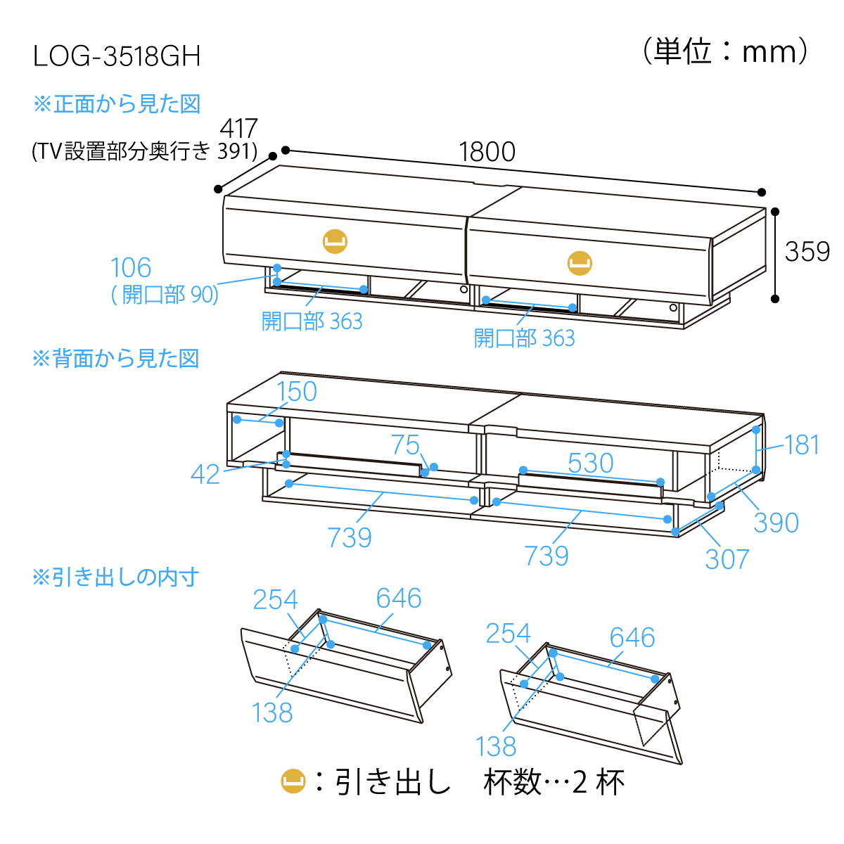 大型テレビが対応する幅約180㎝で、75V型までのテレビが置けます。