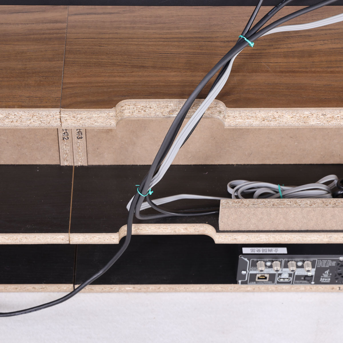 電源線を引きやすくきれいに収納できるように、電源タップの収納ゾーンや配線穴を設けています。
