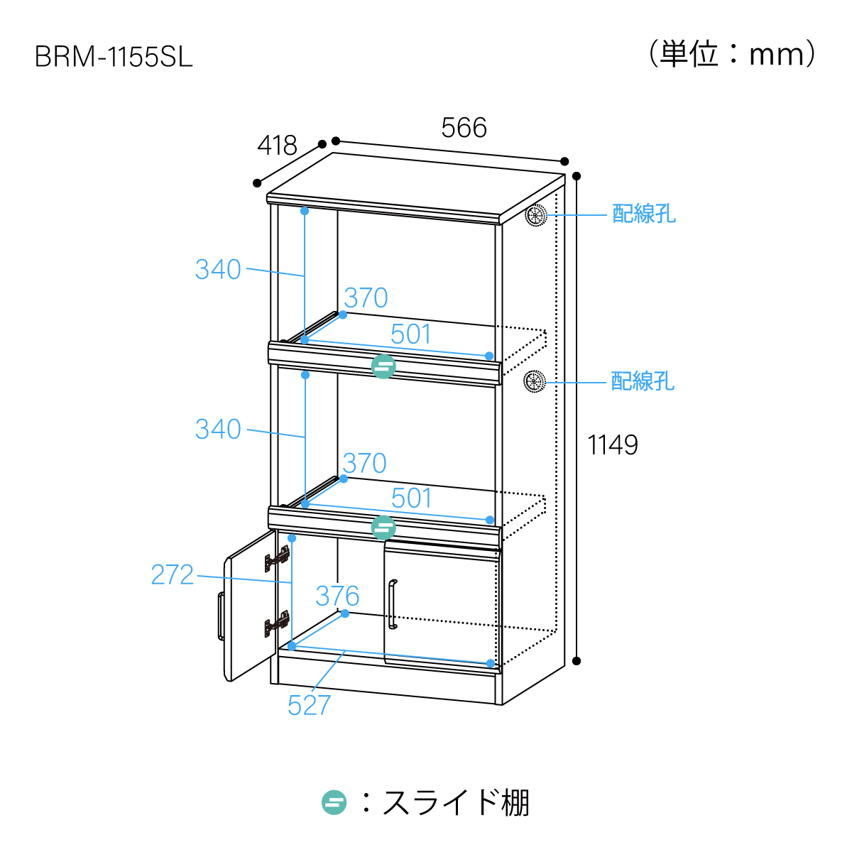 2段のスライド棚のスペースには、それぞれに2口コンセントと配線用ゴムコーダーが付いています。電源コードの長さを気にすることなく家電を収納できます。