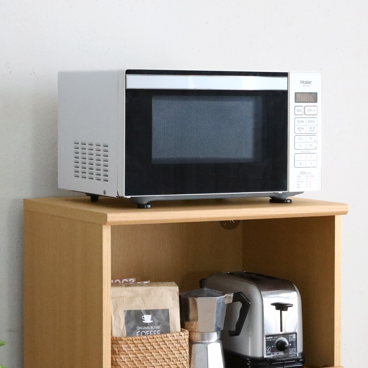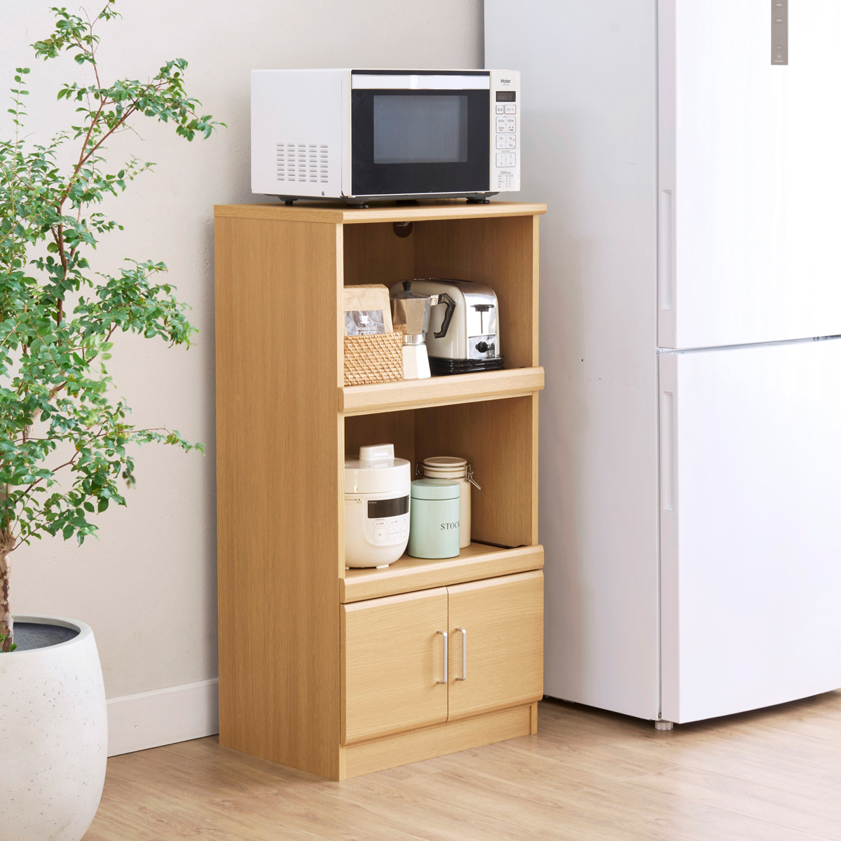 インテリアに柔らかく調和する木目調のキッチン収納ベアルモ。一人暮らし新生活のスタートに、家電収納レンジ台。