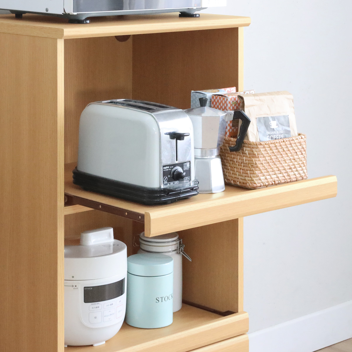 炊飯器などキッチン家電の収納に便利なスライド棚が2段。棚を引き出して、キッチン家電をスムーズに使うことができます。