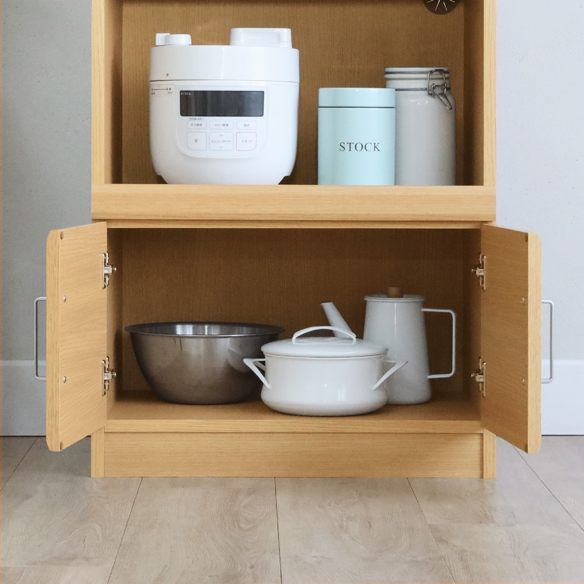 木製扉で鍋やボウルなどのキッチン用品を隠して収納できます。