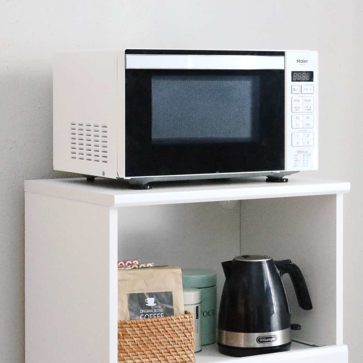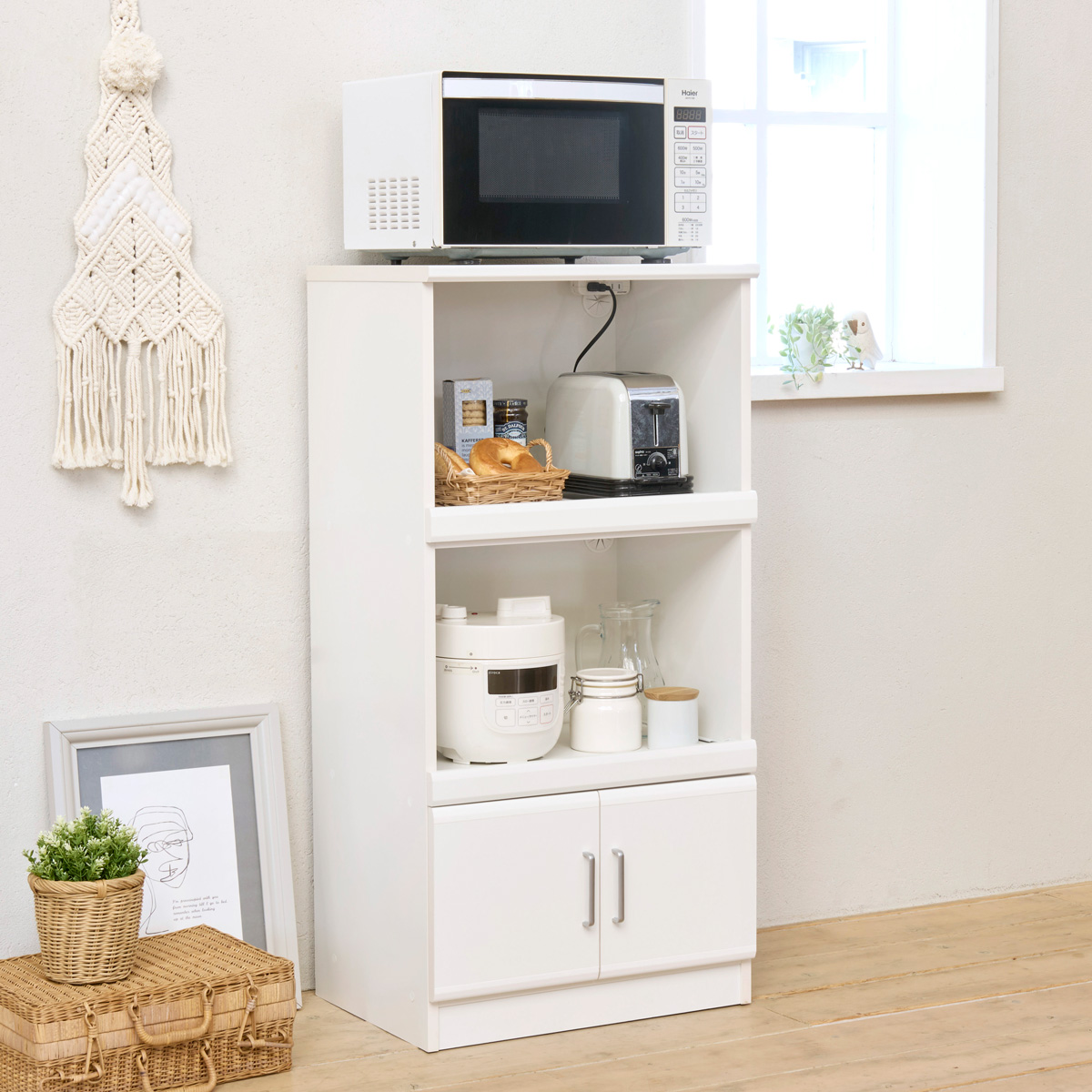 白とシルバーが清潔感のあるキッチン収納ベアルモ。一人暮らし新生活のスタートに、家電収納レンジ台。