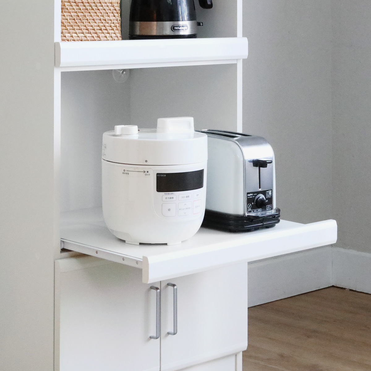 炊飯器などキッチン家電の収納に便利なスライド棚が2段。棚を引き出して、キッチン家電をスムーズに使うことができます。