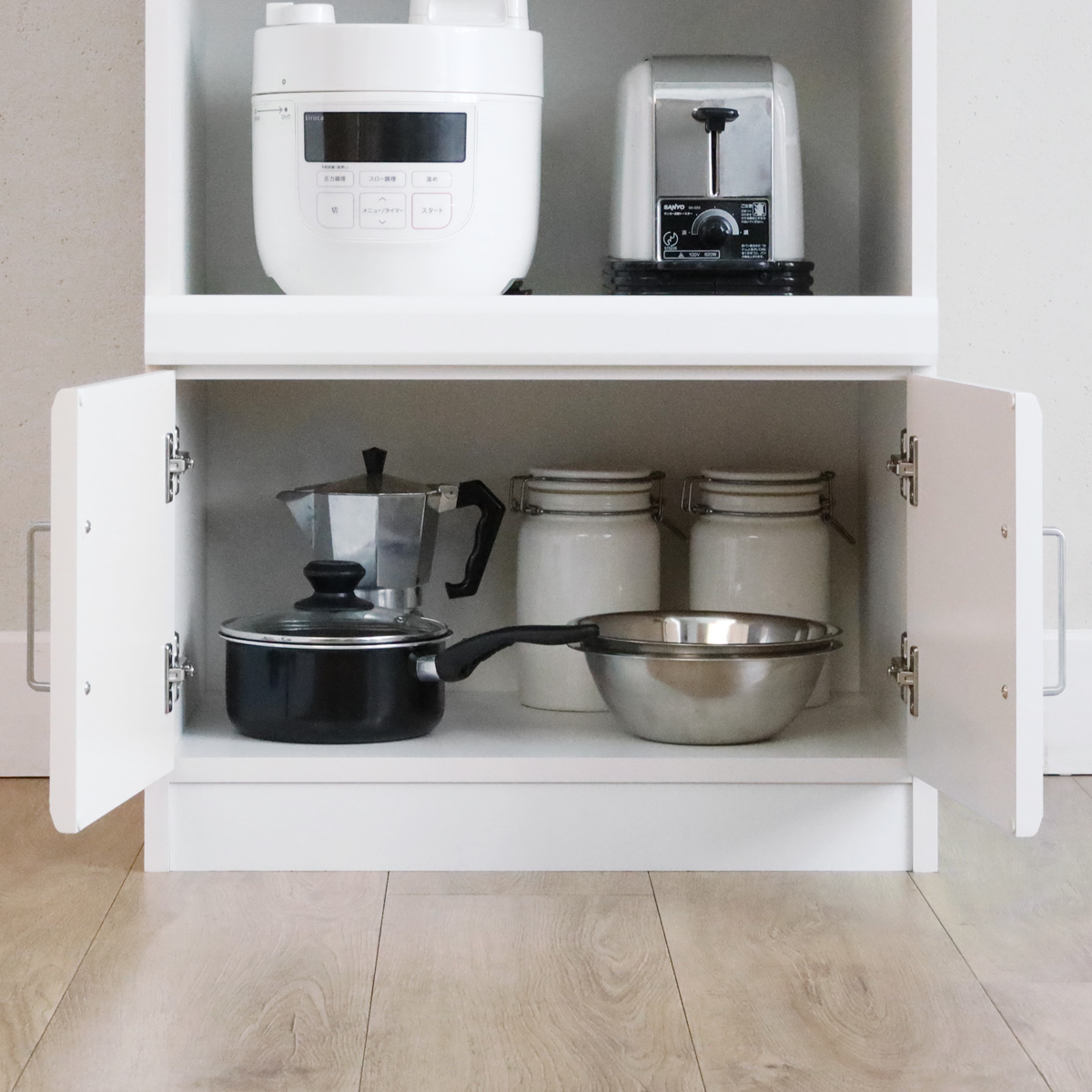 木製扉で鍋やボウルなどのキッチン用品を隠して収納できます。