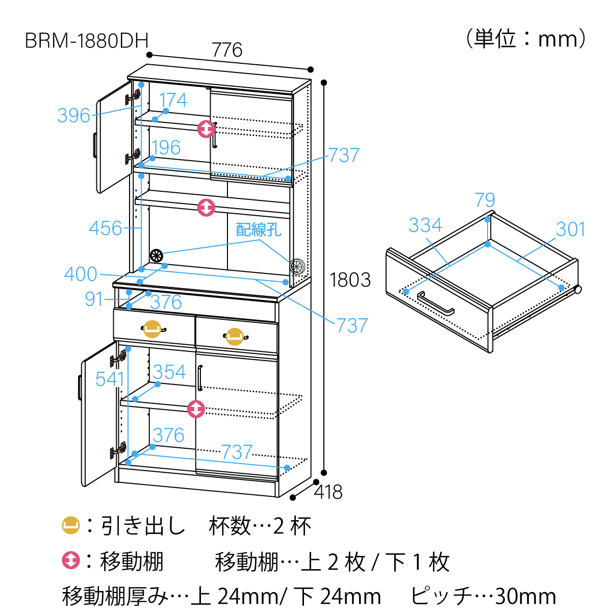 | 耐荷重 | 【レンジ置き場】25kg【中棚1(引出上スペース)】5kg【中棚3(上部扉内)】7kg【地板】10kg【移動棚大(下部扉内)】10kg【移動棚小(上部)】7kg |