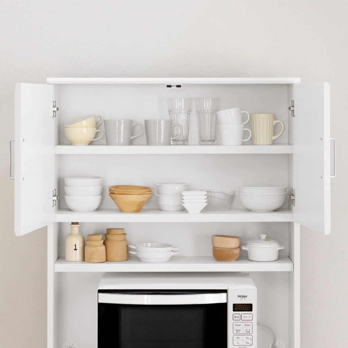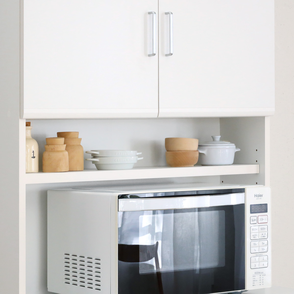 上下の扉内とレンジ置き場上のオープン棚スペースは、3cm間隔で高さを調節できる移動棚。収納したい物に合わせて棚の高さを決めることができます。