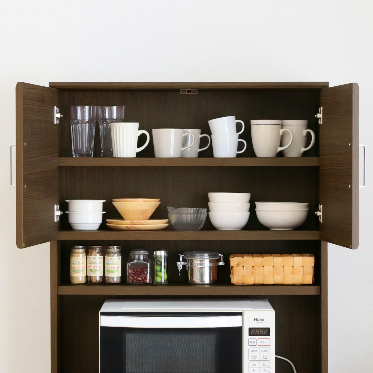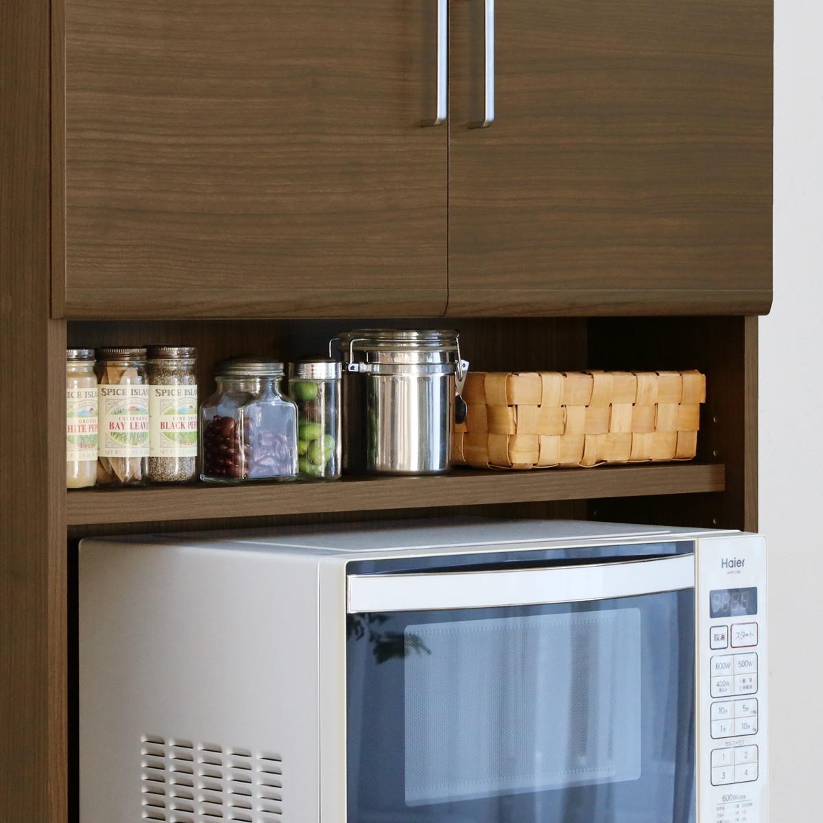 上下の扉内とレンジ置き場上のオープン棚スペースは、3cm間隔で高さを調節できる移動棚。収納したい物に合わせて棚の高さを決めることができます。