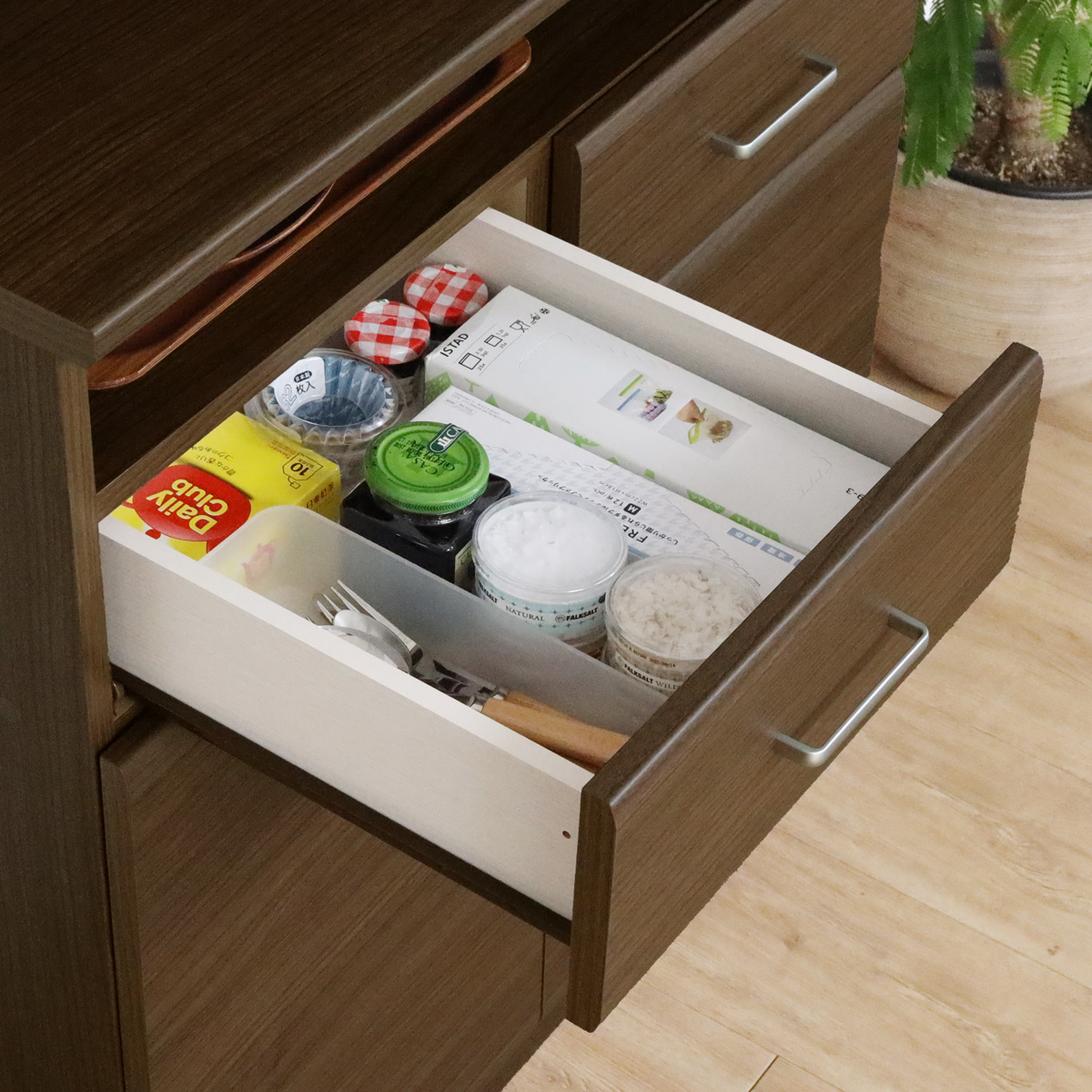 左右に2杯の引き出し付き。カトラリーやキッチン小物をすっきり整理できます。